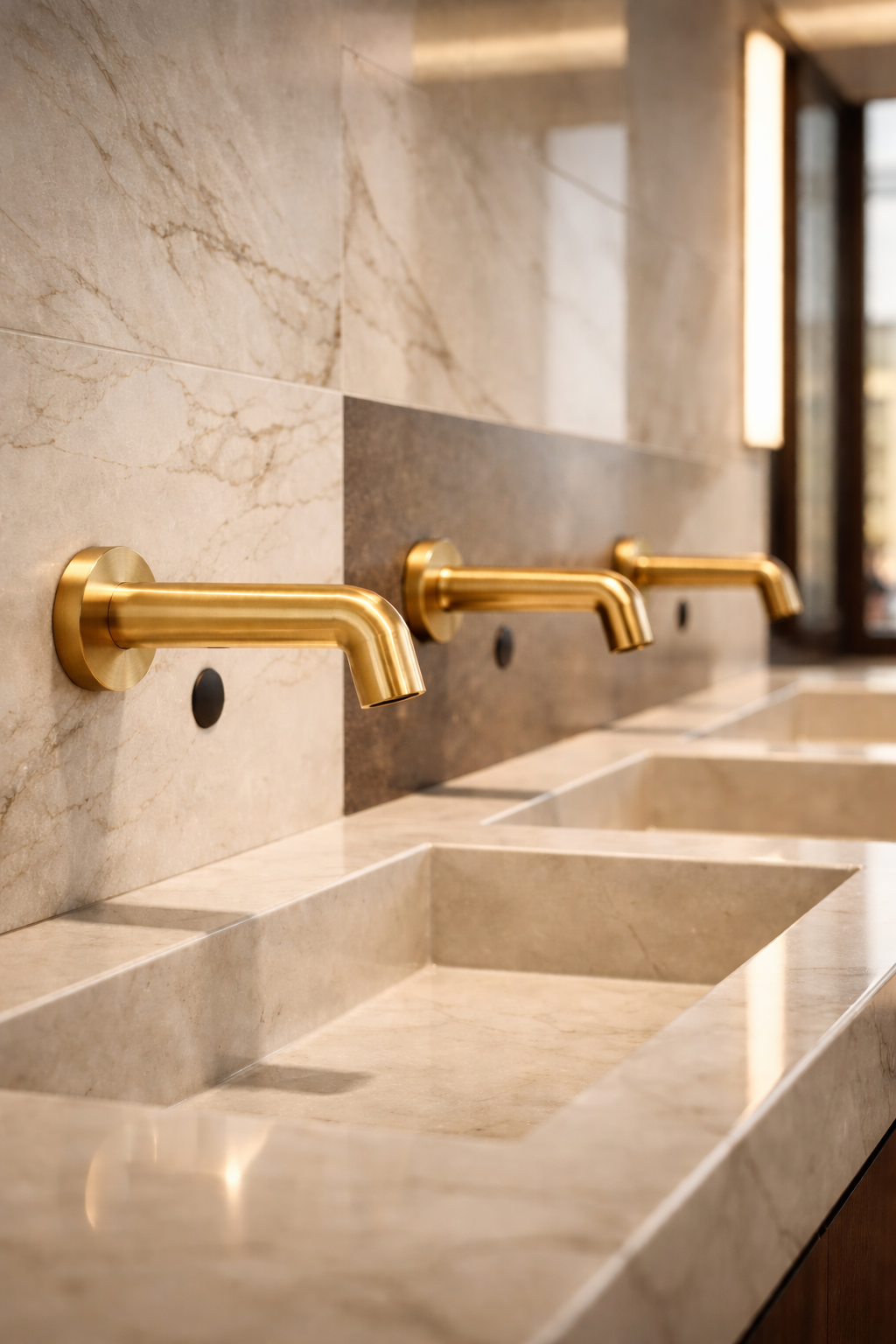Architectural considerations include user reach, sensor positioning, ADA operability logic, and finish durability under chemical cleaning regimes.
